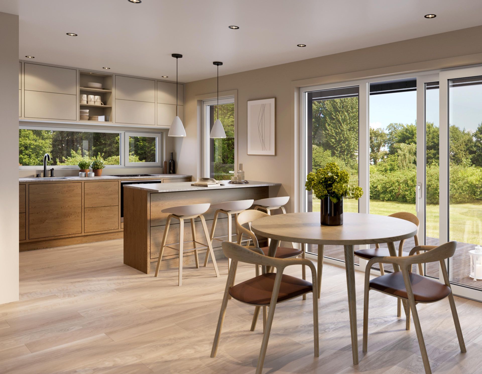 Oppholdsrommet er luftig og innbydende, med soner som gjør det enkelt å kombinere avslapning og sosiale sammenkomster. Store vinduer sørger for rikelig med naturlig lys, og gir en herlig forbindelse mellom inne- og uterom. Den overbygde terrassen og balkongen inviterer til hyggelige sommerkvelder med familie og venner, hvor du virkelig kan nyte omgivelsene.